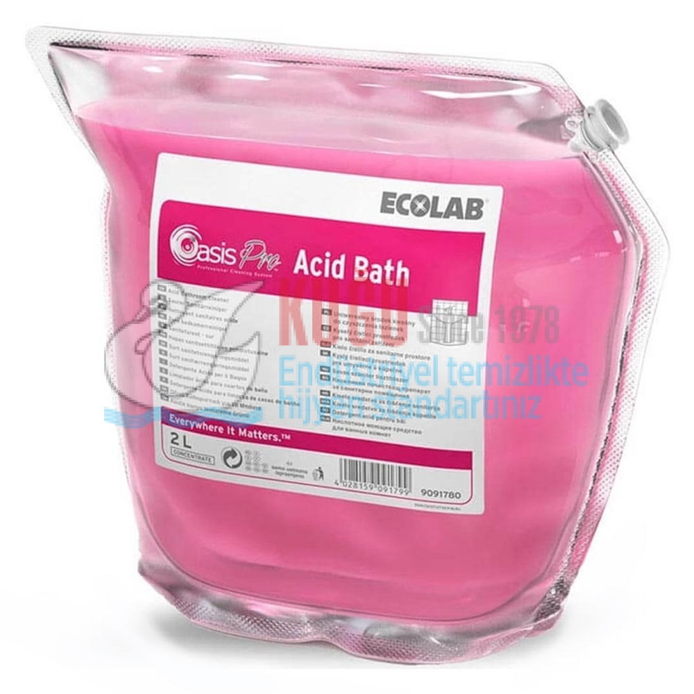 • Ecolab Oasis Pro Acid Bath tüm banyo yüzeylerinin hızlı ve zahmetsiz temizliği için mükemmel köpük kalitesine sahip, güçlü asidik banyo temizleme ürünüdür.